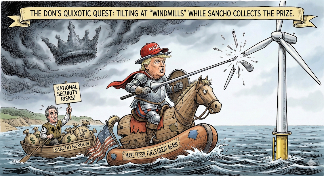 Interior Secretary Doug Burgum, playing the role of Sancho Panza to Trump's delusional knight (though one suspects Sancho Burgum's saddlebags are considerably heavier, stuffed as they are with fossil fuel campaign contributions), announced that all five offshore wind projects under construction on the U.S. East Coast were to cease work immediately. The stated reason? "National security risks identified by the Department of War in recently completed classified reports." Apparently, wind turbines create radar "clutter" that could obscure legitimate military targets.